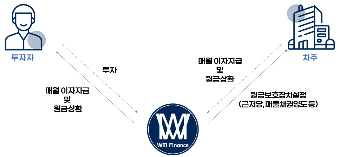 더블유엠에프는 당사만의 독창적인 연구와 기획을 통해 안정적인 부동산 및 관공서의 매출채권 등의 담보를 통해 투자를 진행하고 있으며, 고객의 가치와 신뢰를 우선으로 하는 투자 컨설팅 기업입니다.